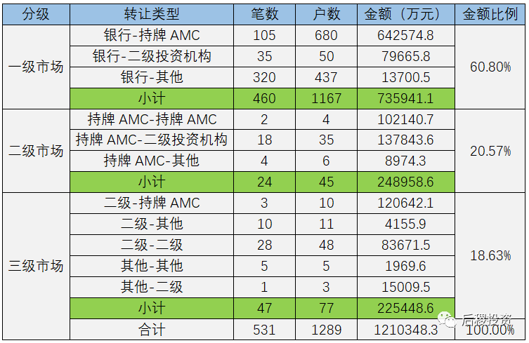 按慣例,我們將行業市場分為三級:銀行出讓債權為一級市場;本地持牌AMC或代持機構在當地出讓債權為二級市場,其余的債權轉讓為三級市場。