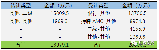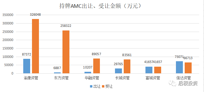 從圖表上能夠看出6家持牌AMC“兩級分化”明顯,渝康資管、東方資管、華融資管、長城資管受讓金額遠多于出讓金額;富成資管、信達資管出讓金額與受讓金額保持平衡。