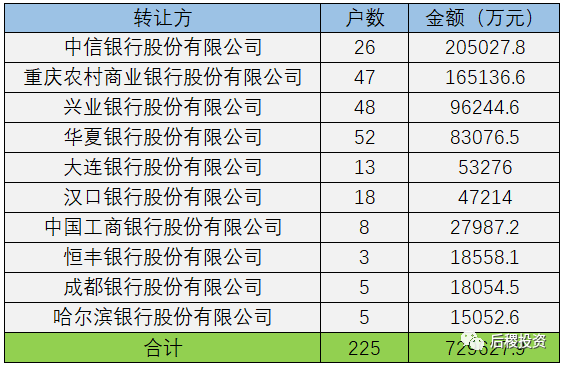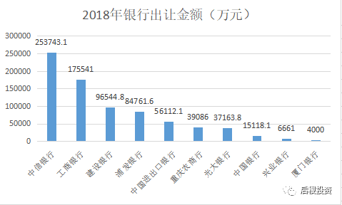 中信銀行出讓金額連續兩年保持第一,建設銀行、浦發銀行、中國進出口銀行、光大銀行、中國銀行、廈門銀行跌出前十,華夏銀行、大連銀行、漢口銀行、恒豐銀行、成都銀行、哈爾濱銀行則進入前十榜單。