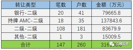 2019年二級投資機構共出讓260戶,出讓債權金額31億余元,其中持牌AMC-二級為主要轉讓類型。