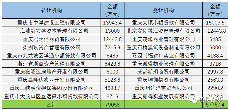 轉讓機構中,上述10家轉讓機構出讓總金額近8億元,在三級出讓市場中占38%;受讓機構中,上述10家受讓機構受讓總金額近6億元,在三級受讓市場中占18.3%。相對其他省份而言,在重慶不良資產三級市場上,多次見到小額貸款公司的身影,該特征與重慶當地政策息息相關。
