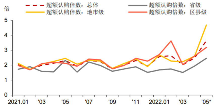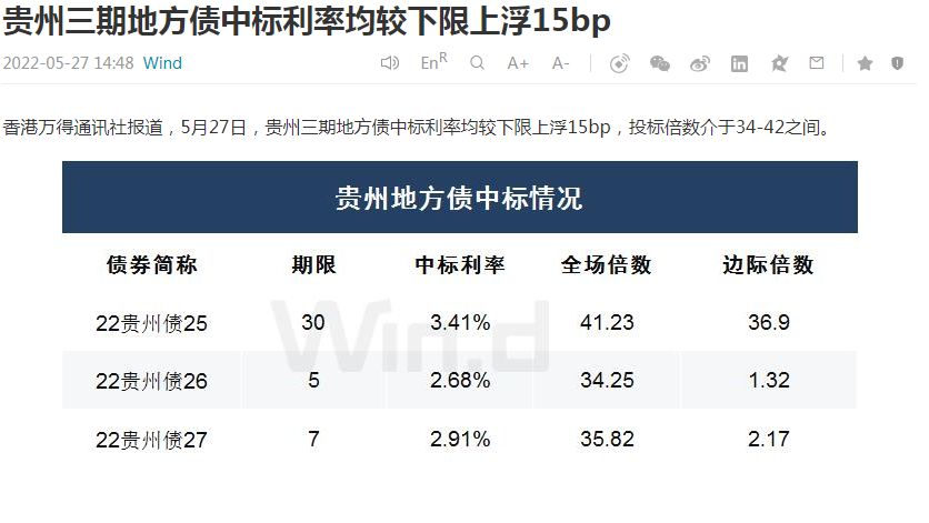 無獨有偶,5月27日,貴州三期地方債中標利率均較下限上浮15bp,投標倍數介于34-42之間。數據顯示,22貴州債25/26/27(對應期限30/5/7)的全場認購倍數為41.23/34.25/35.82。