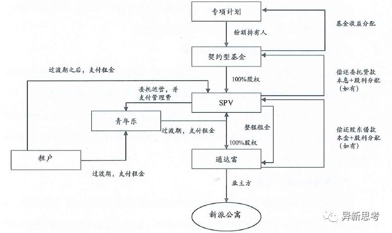 在搭建該類REITS結構前的既有結構中,青年樂為新派公寓的整租方和運營方,即青年樂與通達富簽署《整租協議》,并定期向通達富支付租金,青年樂再將新派公寓轉租給租客,賺取租金差價;在該交易結構中,由SPV、通達富、青年樂簽署三方《委托管理協議》,期限5年,約定SPV承接青年樂的職能,從通達富整租新派CBD物業(yè)并對外分租,原青年樂和通達富的總租關系終止。SPV委派青年樂提供租賃運營管理服務,包括但不限于確定金水平、催收、日常管理物業(yè)改造等安排,青年樂業(yè)績激勵費占當年SPV的分租租金和綜合配套收入之和的【5】%,且青年樂承諾從2018年起,SPV每年可分配凈現金流不低于【800】萬/年(扣除青年樂的業(yè)績激勵費之后);若SPV的可分配凈現金流不足上述標準的,青年樂承諾無條件不可撤銷地予以差額補足。