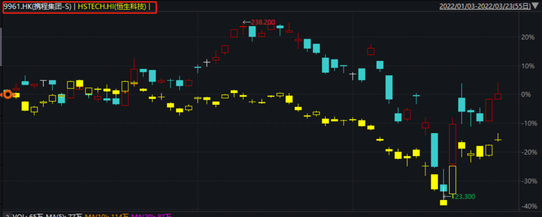 在整體股市表現不佳的背景下,截至2022年3月23日收盤,攜程集團今年以來的股價上漲0.16%。同期,恒生科技指數、恒生指數分別下跌16.26%和5.32%。