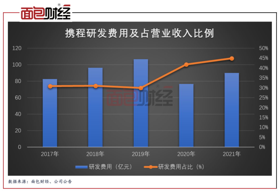 高強度且持續的研發費用投入,正是攜程持續投資于未來的重要體現。數據顯示,攜程2021年的研發費用達到90億元,同比增長17%。2021年,公司研發費用占營業收入的比例更是達到約45%,相比2020年約42%的高基數進一步上升。