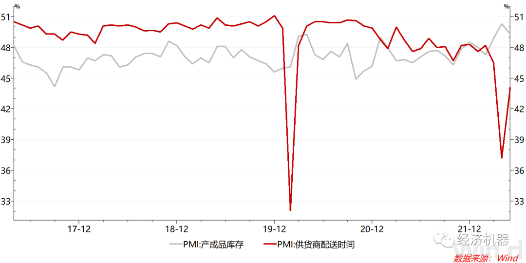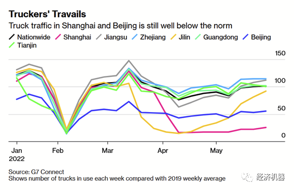 PMI配送時間指數與我們看到的物流和港口數據是基本一致的。可以看到5月以來,隨著城市的逐步開放,各地的卡車流量均有所回升,說明供應鏈正在好轉。但從全國范圍內看,最近一周卡車流量仍較去年同期低21%。