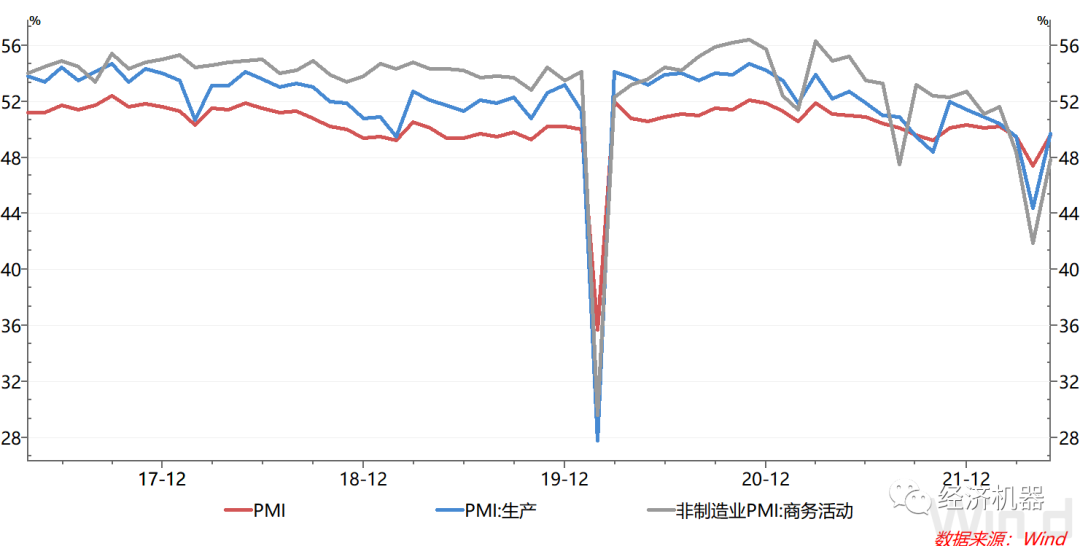 1)制造業和服務業同步回暖,制造業恢復相對更好。5月,PMI為49.6%,較上月回升2.2個百分點,高于3月49.5%的水平。其中,生產分項指數為49.7%,較上月回升5.3個百分點,也高于3月49.5%的水平。這說明,疫情4月對制造業的的影響基本上得到修復。而非制造業恢復則相對緩慢,可以看到,5月非制造業商務活動指數錄得47.8%,較上月有顯著的回升顯著,但仍低于3月48.4%的水平(圖1)。服務業受沖擊大,恢復也相對較慢的困難在于,疫情下線下消費、服務場景受到嚴重的限制。