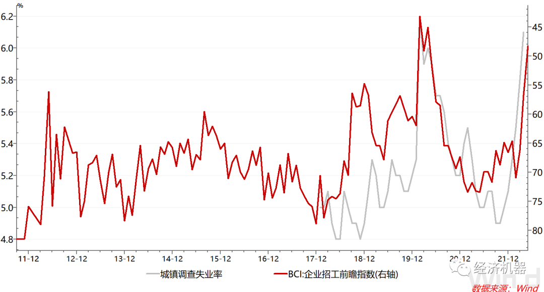 服務業吸納了我國接近一半的就業人口,服務業從業指數的回落表明短期內,整體就業形勢仍不容樂觀。這與我們跟蹤的另一就業指標相對一致。我們可以看到BCI企業招工前瞻指數對失業率有一定指示作用(圖9)。5月,最新的BCI招工指數繼續下行,也表明當前就業依然承壓。