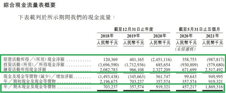 比如,招股書就說,2020年以及2021年前5個月,錄得負經營現金流量。