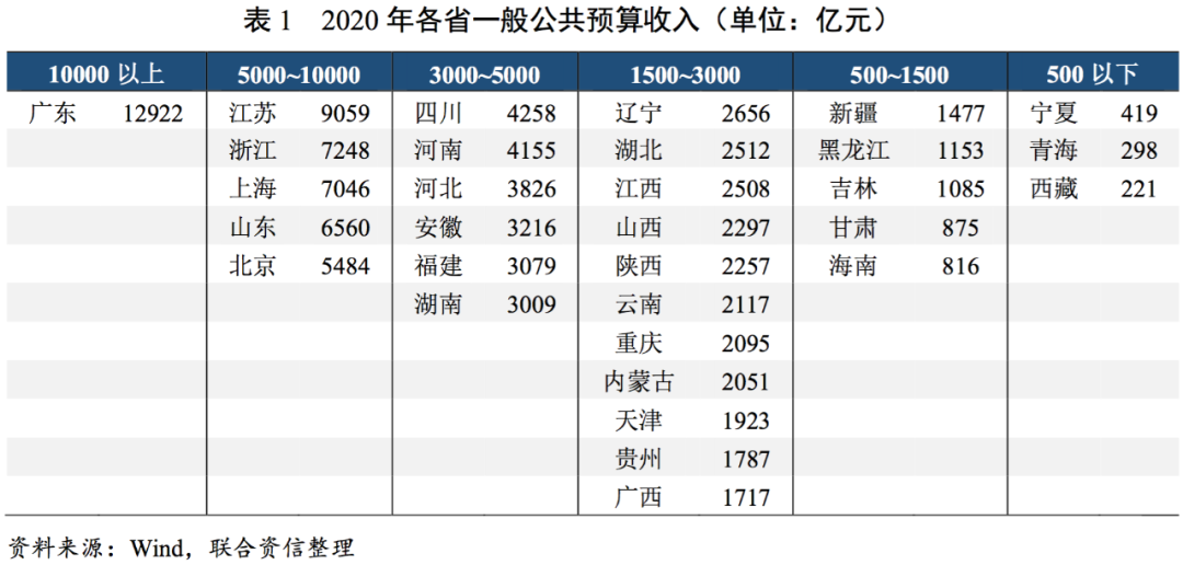 2020年,各省一般公共預算收入規模差距仍較大,根據一般公共預算收入規模劃分,大致可將全國31個省份劃分為六檔,其中廣東省仍是全國唯一超萬億元的省份,財政實力強勁。有11個省份的一般公共預算收入處于1500~3000億元,6個省份收入處于3000~5000億元,一般公共預算收入1500~5000億元是較為集中的收入水平。