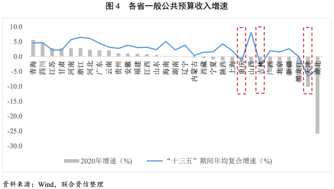 2020年,全國近半數省份一般公共預算收入下滑,其中天津、重慶、吉林在“十三五”期間年均復合增速為負,2020年的收入下滑不僅是由于疫情對供給和需求的沖擊,亦受到近年實施的減稅降費及核心產業增長乏力等因素的影響較大。2020年各省一般公共預算收入增速中位數為同比增長0.1%,增速下滑的省份有14個,其中湖北、北京、新疆、黑龍江等地疫情集中爆發面積較大,受到的負面影響相對較大;另外,受近年推行的減稅降費政策以及部分核心產業增長乏力等因素影響,重慶、吉林、天津等地“十三五”期間年均復合增速均為負增長。