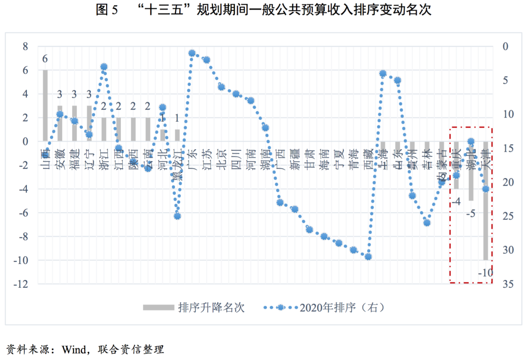 “十三五”期間,山西、安徽等地財政收入排序上升較多,天津、湖北、重慶排序下降較多,財政收入增長動力不足。2020年,是“十三五”規劃期間的收官之年,對比2016年,部分省份一般公共預算收入規模在全國的排序有所變動,代表著當地經濟主體的綜合實力和居民的社會水平在變化。“十三五”期間,山西省一般公共預算收入名次上升幅度最大,2020年較2016年上升6名,主要受益于煤炭行業供給側改革紅利,安徽、福建和遼寧均上升3名,地區財政收入規模提升較快。名次下降方面,“十三五”期間,天津一般公共預算收入排序下滑10名,湖北和重慶分別下滑5名和4名,財政收入增長動力不足。