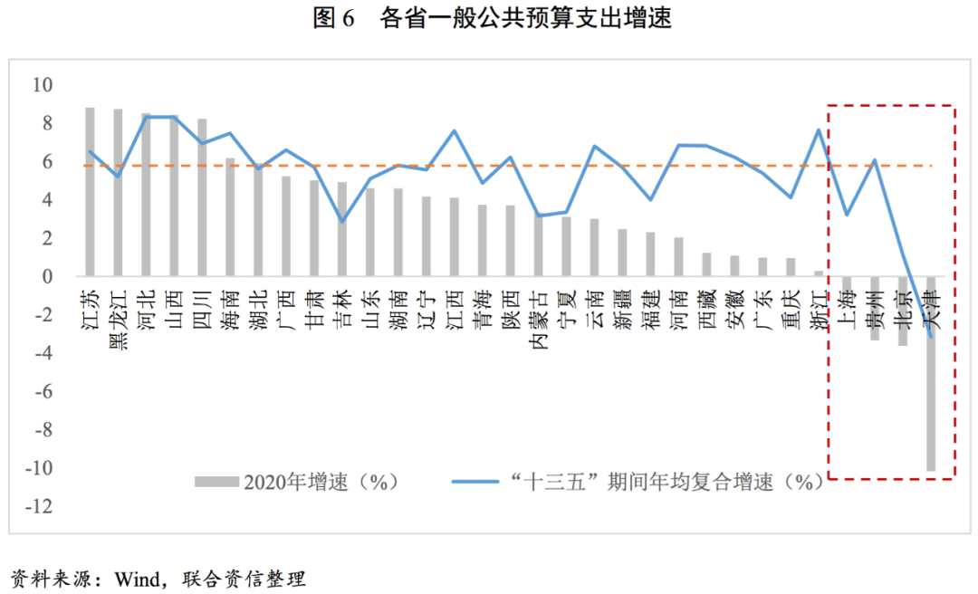 2020年大部分省份一般公共預算支出維持擴張態勢,但增速普遍低于“十三五”期間年均復合增速,支出增速呈下降態勢。2020年,一般公共預算支出增速中位數為3.71%,其中除了天津(-10.18%)、北京(-3.63%)、貴州(-3.35%)和上海(-0.94%)的一般公共預算支出同比下降外,其余省份均呈增長態勢。“十三五”規劃期間,各省一般公共預算支出年均復合增速中位數為5.69%,五年間呈現前高后低格局,主要系各地區貫徹執行優化財政支出結構,樹立過緊日子的思想,嚴格壓縮一般性支出,加大對重點領域支持力度,提高資金配置效率等精神指示[2],壓減不必要的財政支出,帶動2019年以來各省一般公共預算支出增速多成下降態勢,以積極應對經濟增速換擋、收支矛盾突顯等問題。