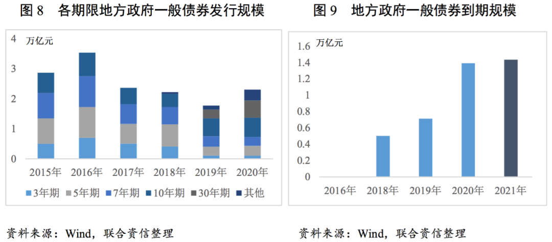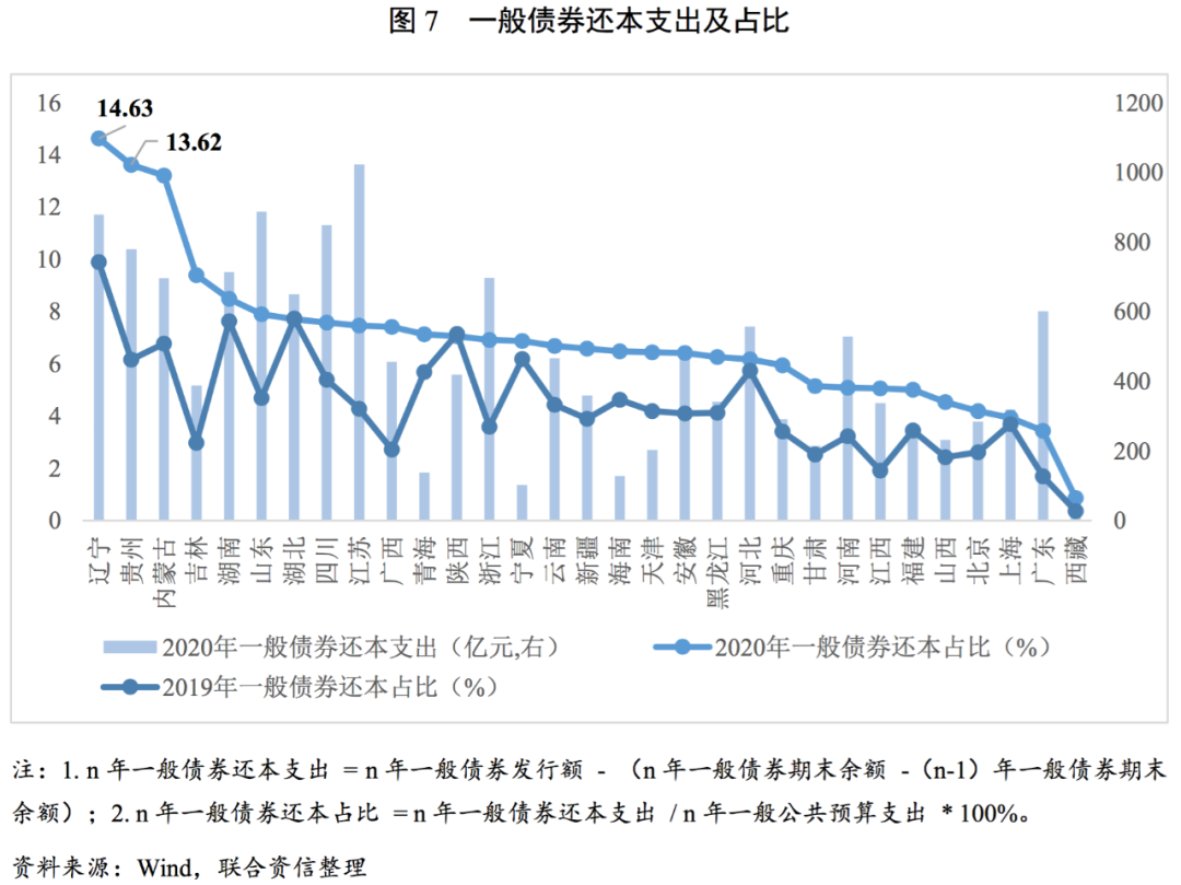 2020年,各省一般公共預算支出中用于償還一般債券本金的占比集中于5%~8%,較2019年進一步提高。2020年是全面實行地方政府債發行以來第一個集中兌付年份,隨著未來各地債券集中到期,各地債券還本支出占比將進一步提升,對其他公共財政支出項形成一定制約。由于2015年是我國地方政府債券實現全面發行的第一年,其中5年期債券發行占比較高,2020年進入政府債券集中兌付年份,各省一般債券還本支出占該省一般公共預算支出的比例持續提升。其中占比最高的省份分別為遼寧(14.63)、貴州(13.62%)和內蒙古(13.21%),較2019年增幅也高于平均水平,三地也相繼發生城投信用風險事件,特別是非標產品的違約。其余省份的一般債券還本支出占比集中于5%~8%。隨著地方政府財政收支緊張程度的加深以及地方政府債務顯性化的推進,地方政府債券成為彌補財政收支差額的工具之一,地方政府債券限額連年提升,2021年地方政府債券還本支出較2020年進一步上升,一定時期內,在地方政府一般預算支出中的占比或將持續提高。