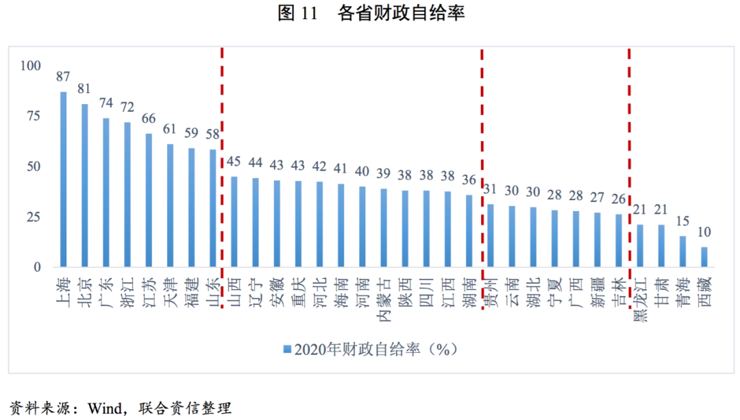 2020年,我國各省財政自給率中位數為38.26%,同比下降20.94個百分點,隨著階段性減稅降費措施的推進以及增值稅留底退稅規模超預期等原因,地方財政緊張局面進一步加劇。具體看,北上廣財政自給程度最高,江浙隨后,天津、福建及山東財政自給率亦在60%左右,整體自給能力較強,其中天津雖然財政收入下滑,但也相應縮減財政支出,財政自給程度仍位列全國前列。多數省份財政自給率處于35%~45%,低于30%的省份中以西南、西北和東北為主,其中西北及東北省份財政收入規模小,財政自給率低更多是收入端的原因,而西南省份及廣西財政收入規模處于全國中等水平,但財政支出相對規模較大,財政自給率低更多是支出端的原因。
