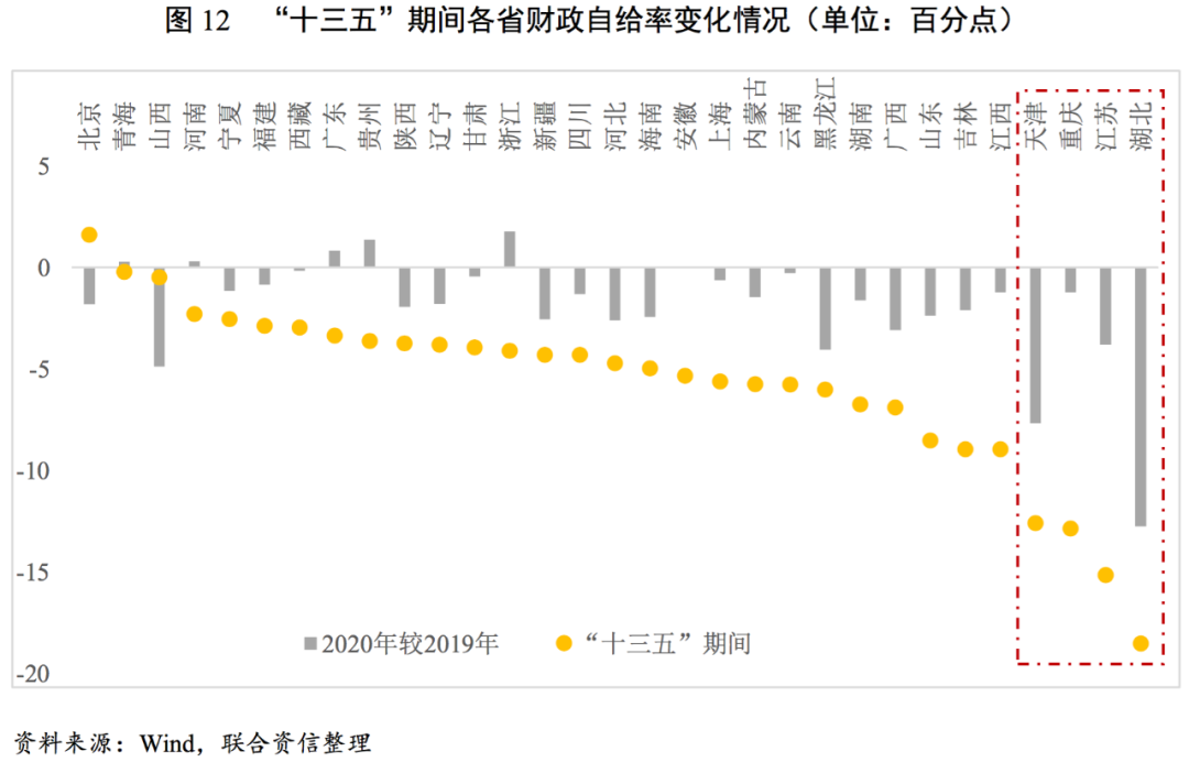 從財政自給率變動情況看,2020年,湖北、天津財政自給率下降最多,分別為13個百分點和8個百分點,大部分省份僅下滑1~2個百分點。從整個“十三五”規劃期間看,各省地方財政平衡能力均呈減弱趨勢,其中湖北、江蘇、重慶、天津財政自給率下滑幅度較大,超過10個百分點,地方財政緊張程度加深。