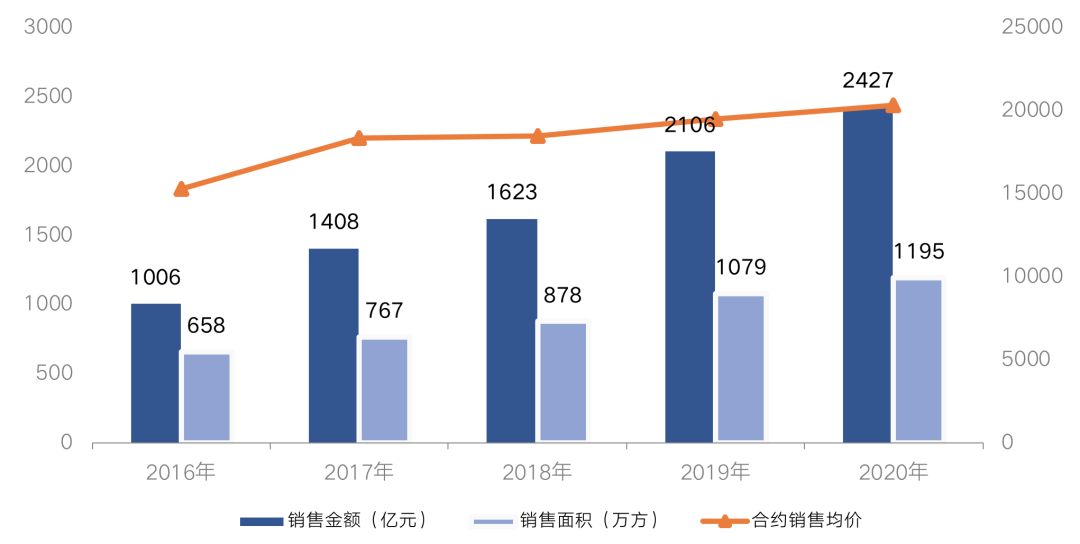 2020年金地集團業(yè)績量價齊升,全年實現合約銷售金額2426.8億元,銷售面積1194.8萬平方米,分別同比增長15.2%和10.7%。