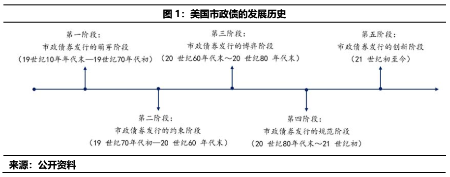 從歷史的脈絡(luò)來看,美國市政債的發(fā)展從19世紀(jì)初開始,歷經(jīng)200年的時間,大概經(jīng)歷了五個具體的階段: