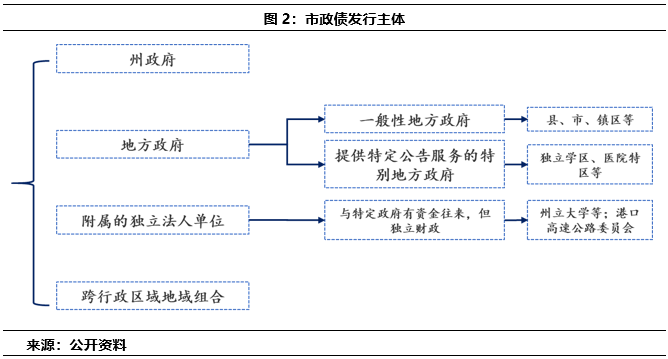 當(dāng)下而言,美國市政債的發(fā)行主體主要為州、地方政府或者前兩者的附屬單位,此外還可以為跨行政區(qū)域的地域組合,具體如圖2。此外,需要注意的一點是美國是邦聯(lián)制國家,雖然這些地方政府大小不一,但從制度來看,他們發(fā)行市政債券具有獨立自主權(quán),在不違反聯(lián)邦和州法律基礎(chǔ)上,不需要聯(lián)邦政府和上級州的批準(zhǔn)和同意,獨立發(fā)行亦獨立負(fù)責(zé)償還責(zé)任。