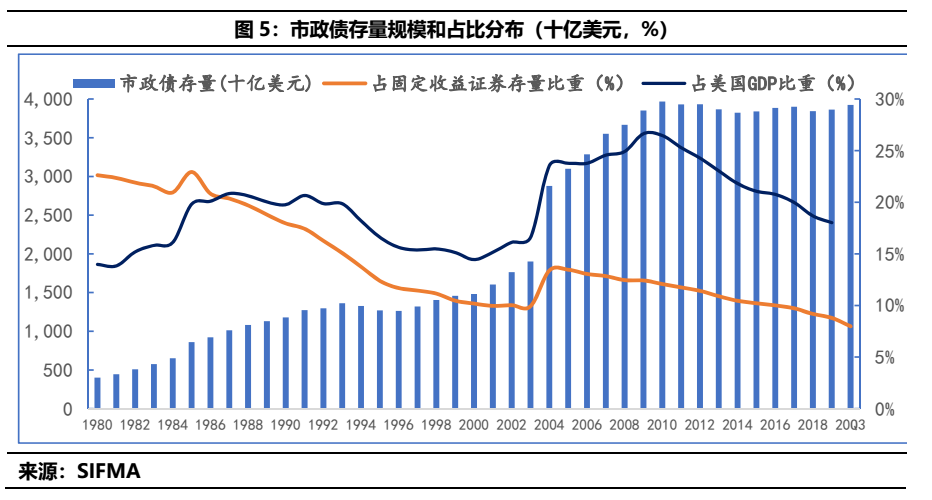 2)其次,我們介紹了當(dāng)下市政債的定義以及20世紀(jì)80年代以來美國市政債的規(guī)模和現(xiàn)狀分析:絕對規(guī)模的大體穩(wěn)定和相對規(guī)模漸漸下滑,似乎是城市化和工業(yè)化到了一定進度上的體現(xiàn),但其仍扮演者極為重要的角色。