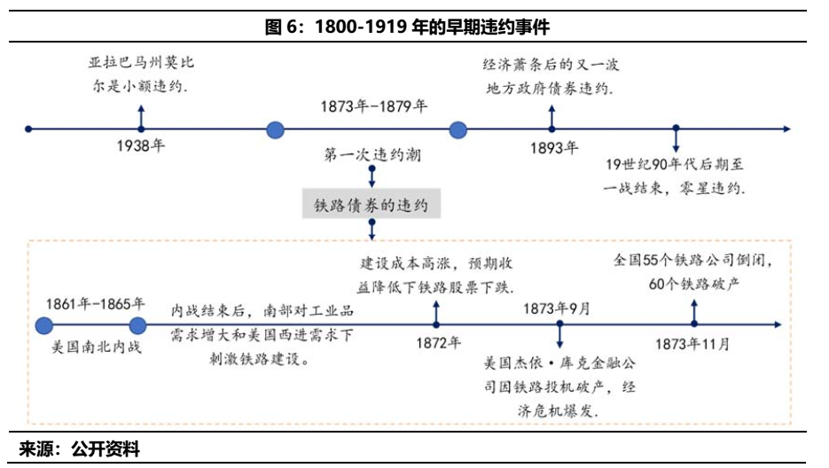 美國的鐵路債券在此次違約潮中的影響不可小覷。美國鐵路投資的熱潮主要系南北戰(zhàn)爭結(jié)束后,南方對于北方工業(yè)品的需求以及美版“西部大開發(fā)”的促使之下,導(dǎo)致鐵路建設(shè)利潤可觀。但由于鐵路行業(yè)資金密集型的特征下,催生了債市需求,而美國早期的鐵路公司源于州政府批準(zhǔn)的特許經(jīng)營公司,因此具有市政債的概念。在1873年經(jīng)濟大恐慌中,向公眾大規(guī)模發(fā)行鐵路債券、且控制北太平洋鐵路的伊杰·庫克公司破產(chǎn)之后,大范圍的鐵路債違約潮爆發(fā)。