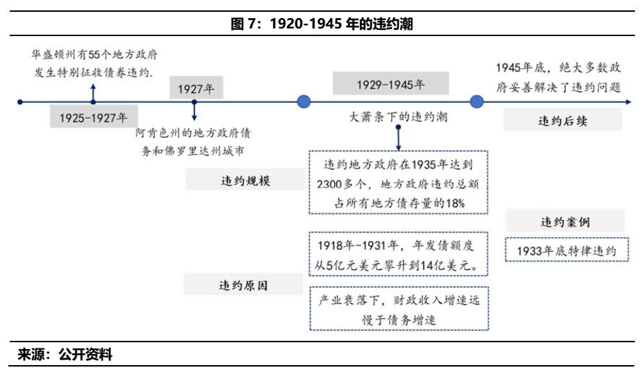 a)1925-1927年,華盛頓州有55個地方政府發(fā)生了特別征收債券的違約;其二是1927年,阿肯色州的地方政府債務(wù)出現(xiàn)困難,但最后以來州政府救助解困,出資5000多萬美元,償還1/3債務(wù);3)1927年,佛羅里達(dá)州的城市因房地產(chǎn)泡沫而出現(xiàn)相關(guān)的地方債務(wù)違約情況。但整體來看大蕭條之前的市政債違約,仍然以零星為主,規(guī)模亦較為一般。