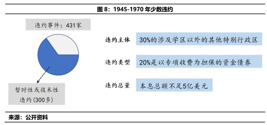 二戰(zhàn)結(jié)束后,美國經(jīng)歷了將近30年的經(jīng)濟繁榮,因此期間的地方政府違約較少。根據(jù)比較完整的統(tǒng)計,1945-1970年間,僅有431起違約,其中300多起涉及銀行查賬,屬于暫時性或技術(shù)性違約。同時這些案例中,涉及的投資者以地方政府所在區(qū)域的小銀行為主,影響范圍小。
