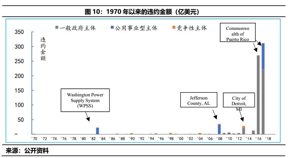 2013年底特律市的破產(chǎn),違約金額高達(dá)200億美元;2016-2017年則是美屬波多黎各的債務(wù)違約,涉及金額合計高達(dá)400億美元。