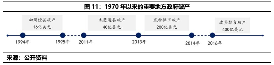 此外,考慮到國內(nèi)城投債與市政債在某些維度上的相同點,關(guān)注風(fēng)險爆發(fā)后的處置或許也能給我們一些可借鑒之處。以史為鑒,我們便來回溯美國歷史上的地方政府破產(chǎn)和違約的“至暗”瞬間: