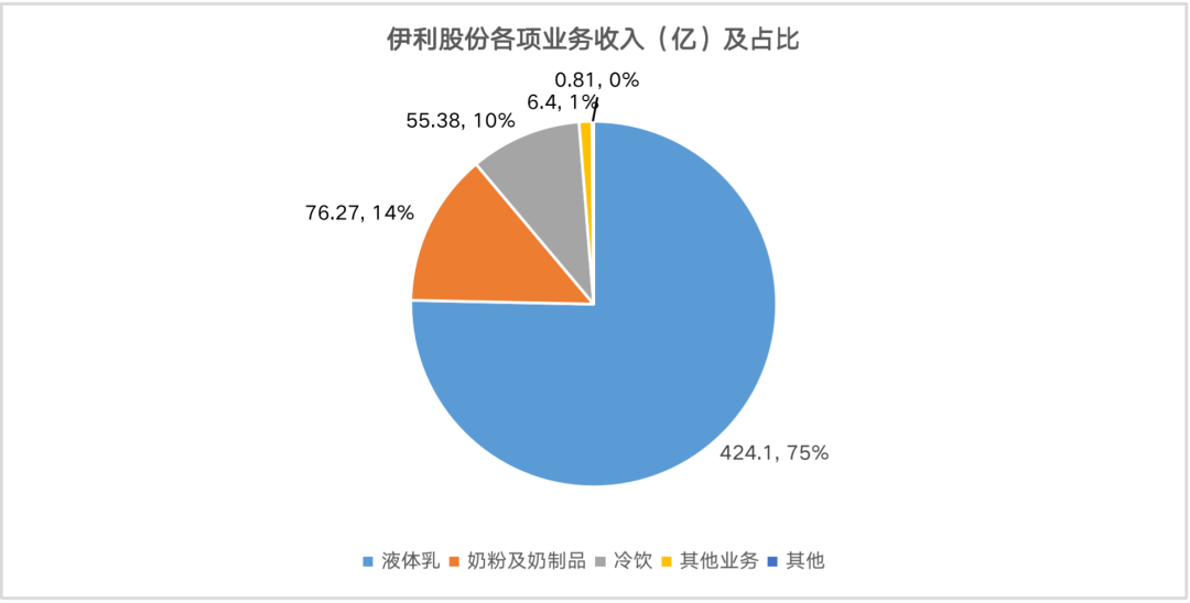伊利的業務整體看較為簡單,當前業務板塊主要包括液體乳、奶粉及奶制品、冷飲及其它項目。其中液體乳業務包括常溫/低溫白奶和酸奶,乳飲料等;奶粉及奶制品主要包括奶粉和奶酪兩大部分,奶粉包括嬰幼兒和成人奶粉,奶酪包括奶酪棒、黃油、芝士等。