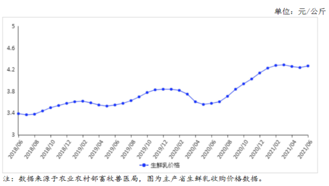 在乳制品行業中,原奶價格始終是成本大頭。原奶主要指的是生鮮乳,也是白奶、酸奶等液態奶的主要原料。下圖是近三年來生鮮乳價格走勢圖,可以看出,價格自18年6月以來產品價格一直處于震蕩攀升狀態。尤其是自去年年中以后,價格明顯步入加速上升狀態。