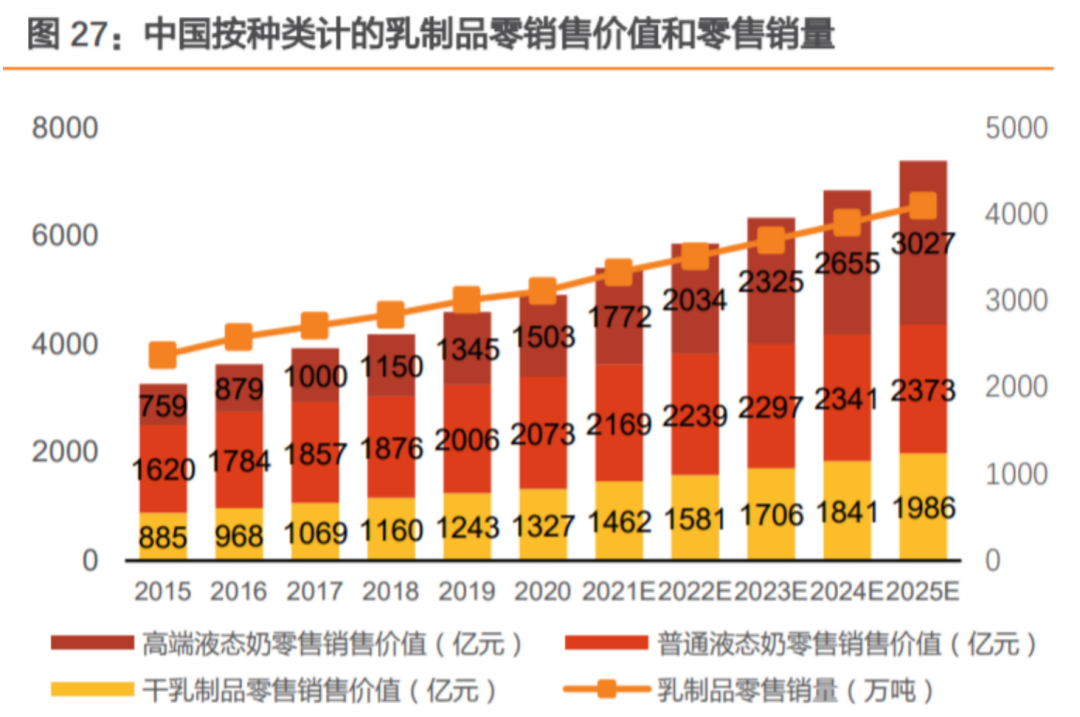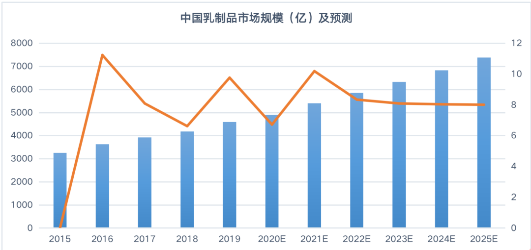 同時根據天風證券研究結果顯示,預計2021年乳制品市場為5403億元,并預計2025年將達到7385億元,2020年至2025年的CAGR為8.5%,整體增長也將趨于穩定。