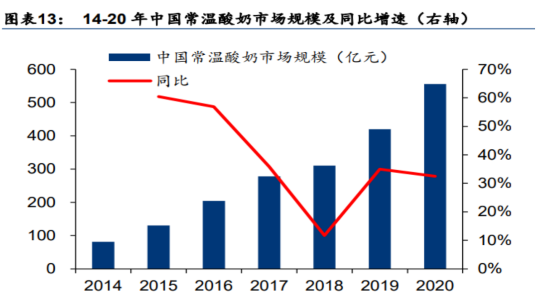 當然,安慕希的成功與常溫酸奶市場的快速增長離不開。根據智研咨詢數據,2015-2020年我國常溫酸奶規模CAGR高達33.7%,市場規模接近550億。