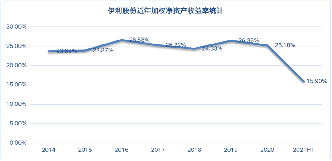 從投資角度看,伊利加權凈資產收益率2021年上半年為15.9%,同比增長2.62%,該數值創出自2012以來最高,如果全年凈資產收益率按上半年兩倍算,折合年化就是31.8%,同樣也是最高。這樣的收益率水平放眼A股也是屈指可數。