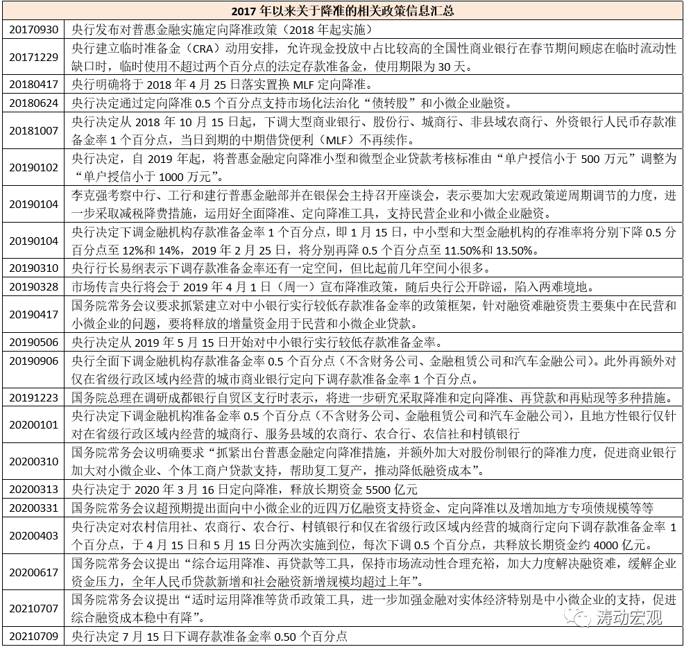 (七)2021年7月7日的國務院常務會議明確“針對大宗商品價格上漲對企業生產經營的影響,要在堅持不搞大水漫灌的基礎上,保持貨幣政策穩定性、增強有效性,適時運用降準等貨幣政策工具,進一步加強金融對實體經濟特別是中小微企業的支持,促進綜合融資成本穩中有降”。隨后2021年7月9日央行決定于2021年7月15日下調金融機構存款準備金率0.5個百分點(不含已執行5%存款準備金率的金融機構)。
