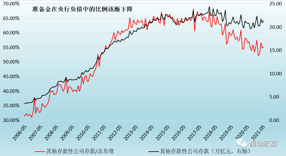 央行的負債主要由基礎貨幣(貨幣發行量+存款準備金)和政府存款兩大類構成,而存款準備金規模則由2017年底的24萬億以上降至目前的20萬億附近,占央行總負債的比例亦由過去65%以上降至目前的55%附近。隨著一般性存款余額的不斷增多,在準備金率不變的情況下,意味著存款準備金余額本身也在不斷上升,因此央行只有通過不斷降準才能對沖余額不斷增長的存款準備金,并通過此舉優化央行的負債結構。
