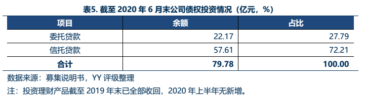 公司債權投資業務主要包括發放委托貸款、信托貸款以及少量閑置資金用于投資理財產品,投放的貸款期限平均為2-3年;截至2020年6月末余額為79.78億元。受資管新規影響,公司的債權投資業務比重自2018年起逐年降低,且更多地通過信托渠道進行,目前收入主要依靠存量項目。