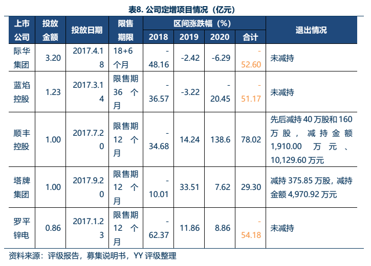 可以看出,除了順豐控股和塔牌集團的股票價格走勢較好之外,其他幾家2018-2020年的累計跌幅均超過了50%,股票價格低于定增價格??傮w而言,公司投放的股票定增項目表現平平,累計收益情況不佳,后續退出情況需關注股票市場走勢。