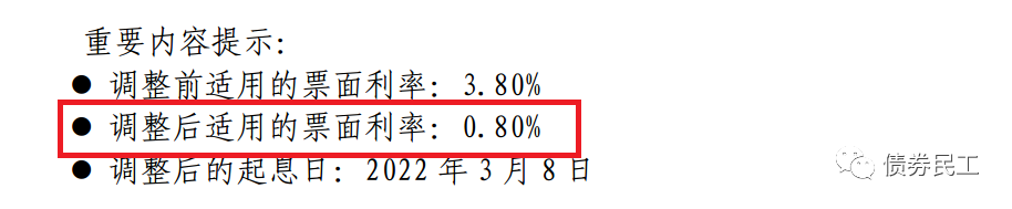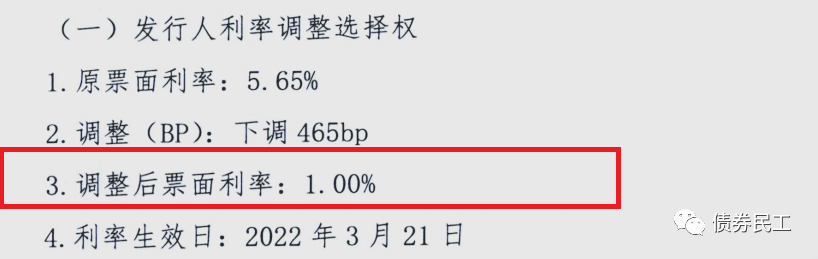 在此之前,債券民工關注到的票面利率調整最低的是某城投公司的中期票據,3+2年期的債券在行權時,將后2年的票面利率調整為1%。