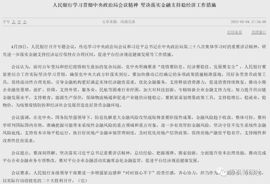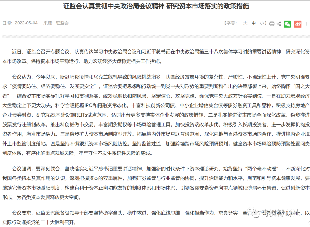一、5月4日,金融管理部門齊發聲,公布4月29日政治局會議(參見剛剛,429政治局會議釋放了哪些重大信號?)的學習新聞稿,雖然沒有太多增量信息,但穩預期的信號卻比較明顯。之所以選擇在這一天齊刷刷公布新聞稿,理由其實很簡單,主要有兩個: