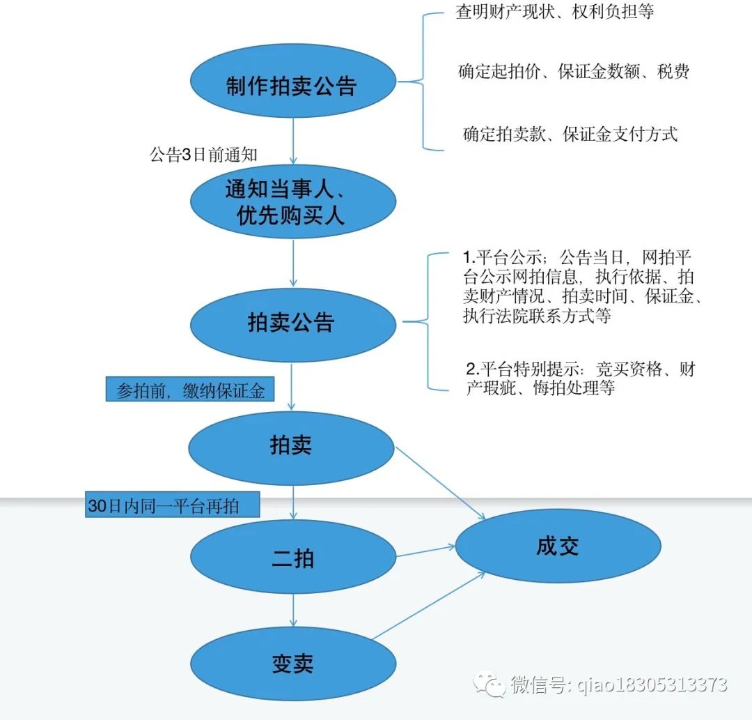 1.制作發布拍賣公告;2.查明財產現狀、權利負擔等內容,予以說明;3.確定拍賣保留價、保證金數額、稅費負擔等;4.確定保證金、拍賣款支付方式;5.通知當事人、優先購買權人;6.制作成交裁定書;7.辦理財產交付或證照權利轉移協助執行通知書;8.開設網拍專用賬戶;9.其他