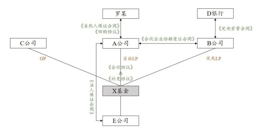 根據公開信息,A公司(劣后級LP)與B公司(優先級LP)、C公司(GP)簽訂《合伙協議》及其《補充協議》,《補充協議》中約定優先級LP對合伙企業出資的前提包括《合伙企業份額受讓合同》及《法人保證合同》簽訂生效。隨后,“X投資管理中心(有限合伙)”(簡稱“基金”) 成立并完成備案,后基金財產名義上用作E公司增資擴股的投資款。