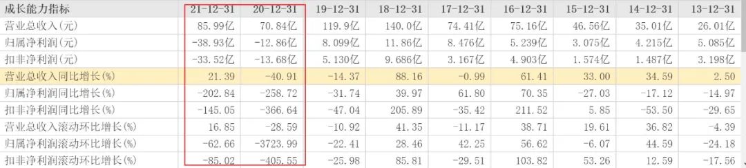 2021年營收略有起色,同比增加21.39%為85.99億元,但遠還沒到恢復(fù)元氣的程度。歸屬凈利潤卻繼續(xù)滑坡,同比大降了202.84%為-38.93億元。
