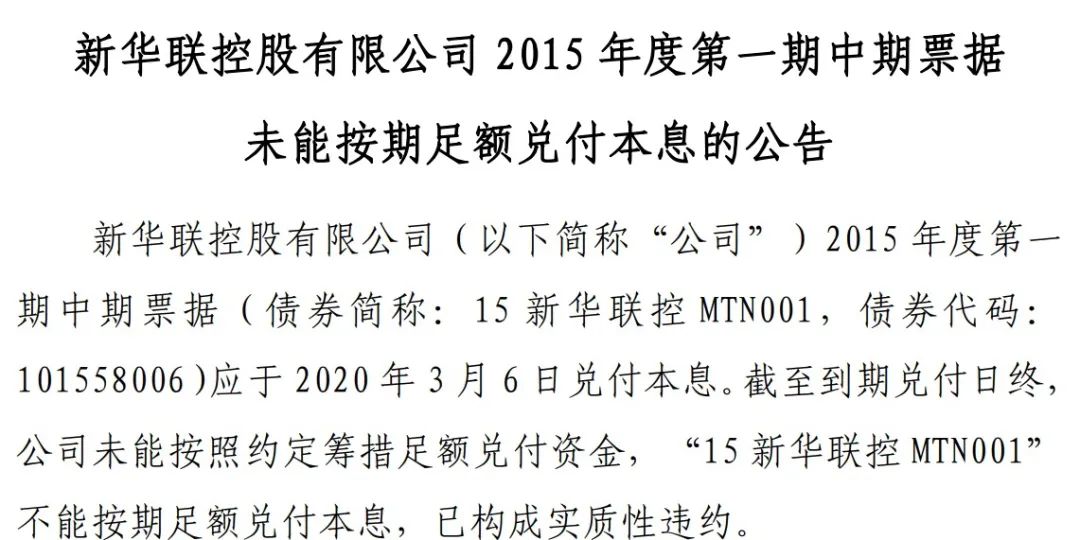 時間拉回到2020年3月6日疫情爆發(fā)初期,新華聯(lián)就已經(jīng)官宣債務(wù)違約,如下圖,同時該違約觸發(fā)了“19新華聯(lián)控SCP002”及“19新華聯(lián)控SCP003”的交叉保護條款約定情形,這兩筆超短期融資券應(yīng)償付本息金額分別為10.68億元、3.73億元,繼續(xù)違約。