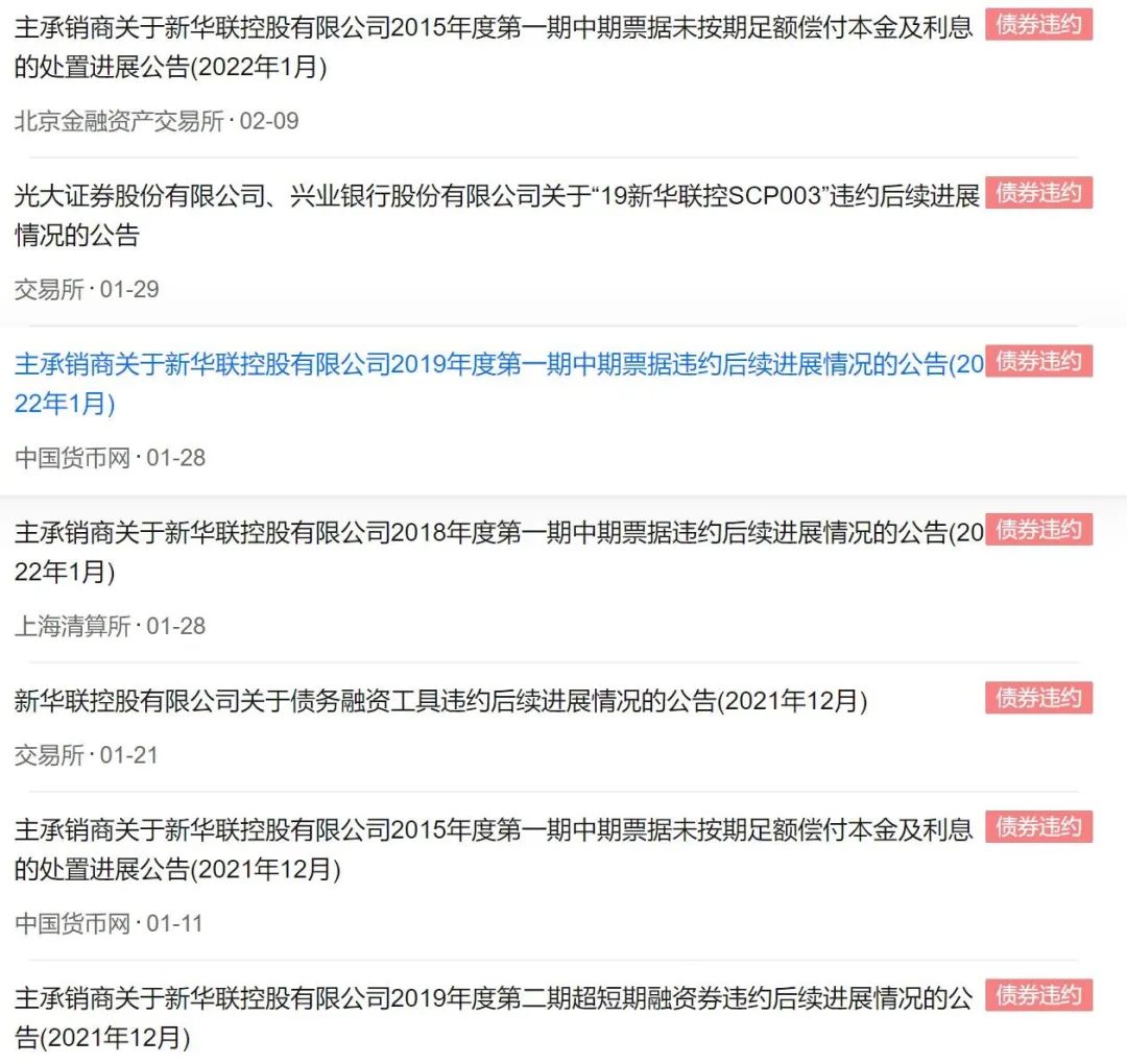 翻閱歷史公告,杠桿地產(chǎn)看到這并非新華聯(lián)首次債券違約。實際上在新華聯(lián)近兩年的公告消息里,其關(guān)于債券違約的相關(guān)內(nèi)容披露占據(jù)了90%以上。