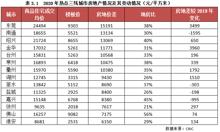 但總體來看,大部分熱點(diǎn)三線城市的房地差均在1萬元/平方米以上,地房比在40%以下,成本風(fēng)險(xiǎn)處于低位。但是如果將2020年房地差與2019年的相比,可以發(fā)現(xiàn),南通、麗水、鹽城、嘉興等城市的房地差是收窄的,尤其是南通,收窄幅度高達(dá)1595元/平方米,主要是原因就是由于2020年南通地價(jià)過快上漲導(dǎo)致