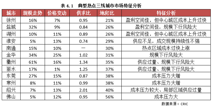 另外,結(jié)合上述我們研究的市場(chǎng)周期規(guī)律以及其盈利空間綜合評(píng)價(jià)來看,大多數(shù)熱點(diǎn)三線的市場(chǎng)前景仍然較佳,投資風(fēng)險(xiǎn)較低。最值得關(guān)注的當(dāng)屬紹興、南通,兩城均受到長(zhǎng)三角一體化利好的影響,在人口吸引力上具有一定的優(yōu)勢(shì),去化速度較優(yōu)。但需要警惕的是,由于近年地價(jià)過快上漲,成本壓力大,利潤(rùn)空間被極大的壓縮,尤其是中心城區(qū)的優(yōu)質(zhì)地塊,盈利空間堪憂。
