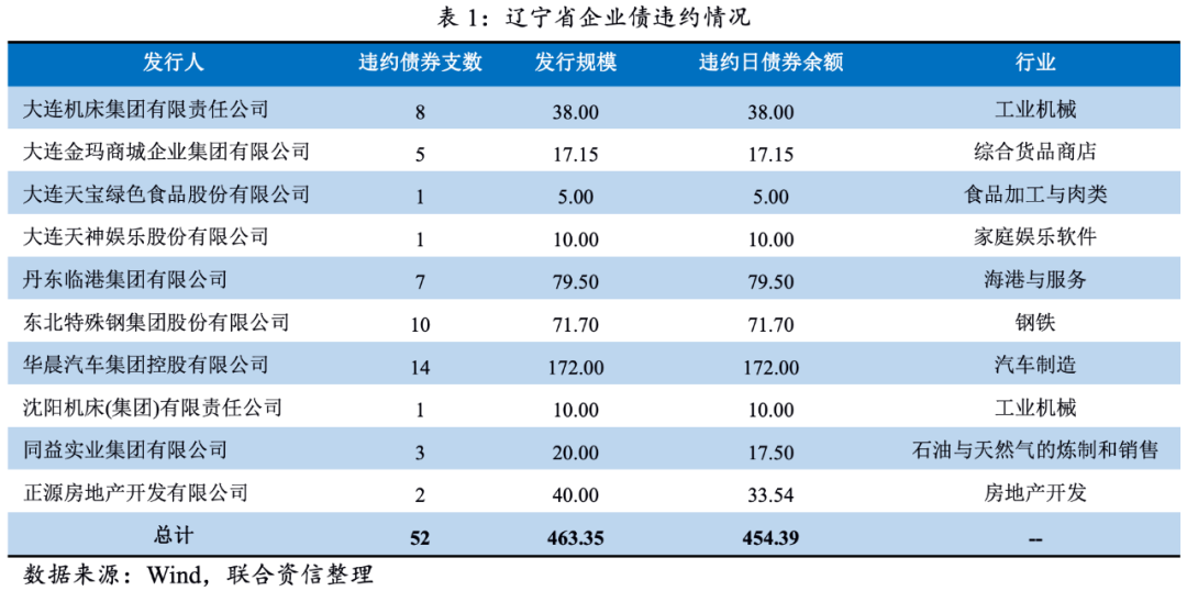 根據(jù)Wind數(shù)據(jù)顯示,截至2021年11月末,遼寧省內企業(yè)債券違約主體10家,涉及債券52支,債券違約余額454.39億元,余額違約率為17.42%。除此之外,沈陽機床股份有限公司發(fā)行的中期票據(jù)通過現(xiàn)金、留債、股票等方式進行了債券清償;沈陽盛京能源發(fā)展集團有限公司發(fā)行的定向融資工具已由第三方代償,并未計入上述統(tǒng)計。從違約主體行業(yè)分布情況來看,遼寧省違約企業(yè)涉及汽車、石油化工、工業(yè)機械、海港、鋼鐵、房地產開發(fā)等領域,企業(yè)性質涉及地方國有企業(yè)及民營企業(yè)。
