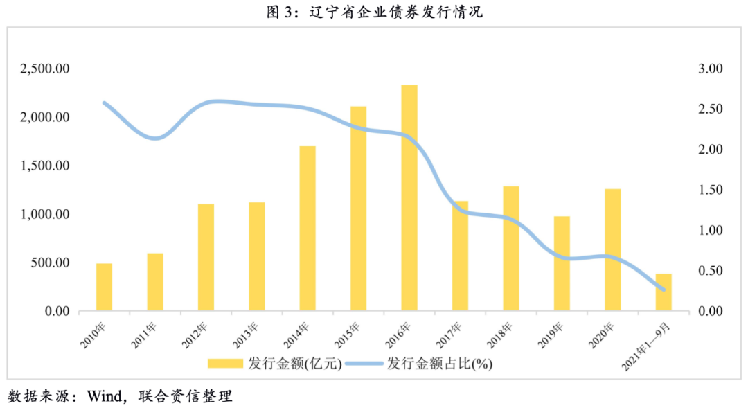 2016年3月,地方國有企業(yè)東北特殊鋼集團股份有限公司發(fā)行的“15東特鋼CP001”觸發(fā)實質性違約,截至2021年11月末,合計違約債券余額71.70億元;2020年10月,華晨汽車集團控股有限公司觸發(fā)實質性違約,截至2021年11月末,違約債券余額172.00億元。近年來,持續(xù)發(fā)生的公開市場違約以及部分地方國有企業(yè)打破剛兌都給遼寧省信用聲譽造成不利影響,資本市場債券發(fā)行規(guī)模明顯下降。從圖3中看出,2016年以后,遼寧省整體債券發(fā)行規(guī)模及占當年全國債券發(fā)行規(guī)模的比重都呈明顯下降態(tài)勢。