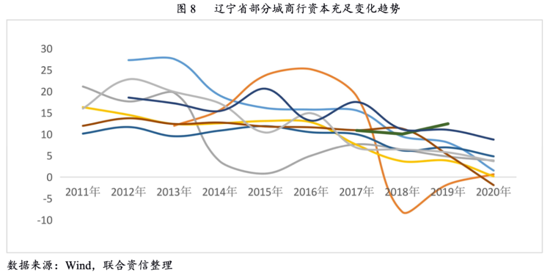 資產充足水平方面,近年來,遼寧省城商行通過利潤留存、增資擴股以及發(fā)行二級資本債券、優(yōu)先股等手段補充資本,整體資本水平較為充足,但部分城商行資本充足水平出現(xiàn)一定程度的下降。一方面,受盈利水平下滑的影響,部分城商行資本內生能力有所減弱;另一方面,部分城商行信貸資產質量下行導致?lián)軅渌讲蛔悖瑢Y本造成較大的沖減,資本面臨補充壓力。